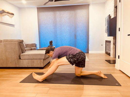 - Maximally stretch out your glute and hip muscles by hinging at your hip and holding over your front leg as much as possible.