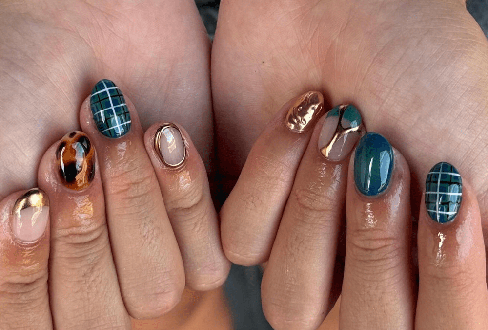“This winter season’s nail trends are all about embracing rich, bold hues with a sophisticated twist,” says Huber-Millet. This mismatched plaid nail look by @nailedit_byash does just this and more, with contrasting deep teal tones, plaid patterns, and reflective gold chrome.